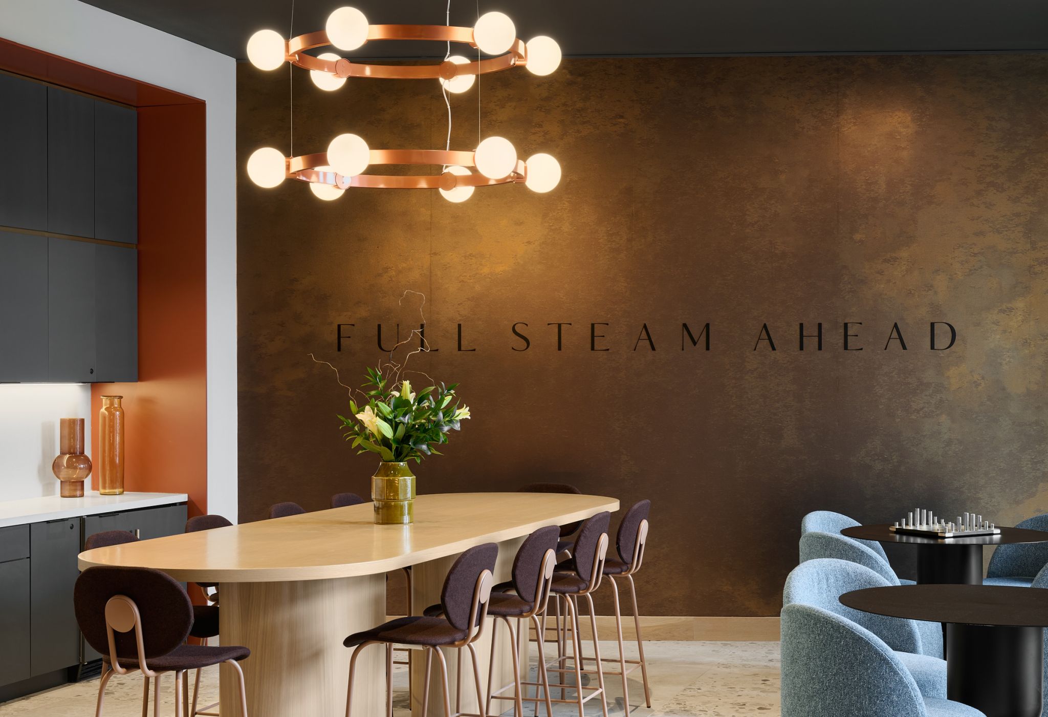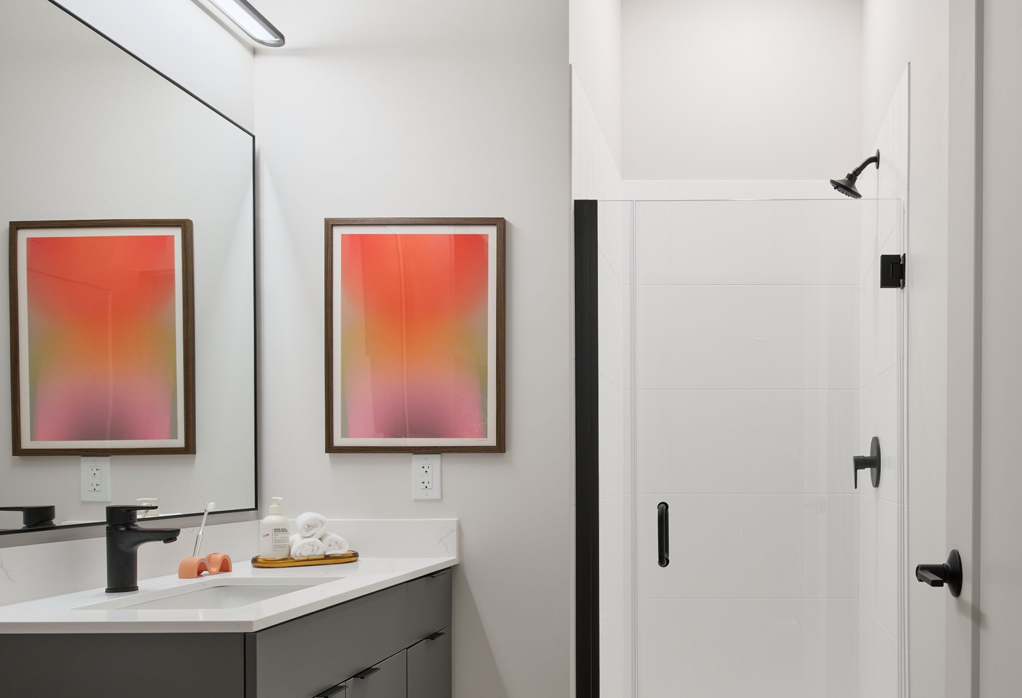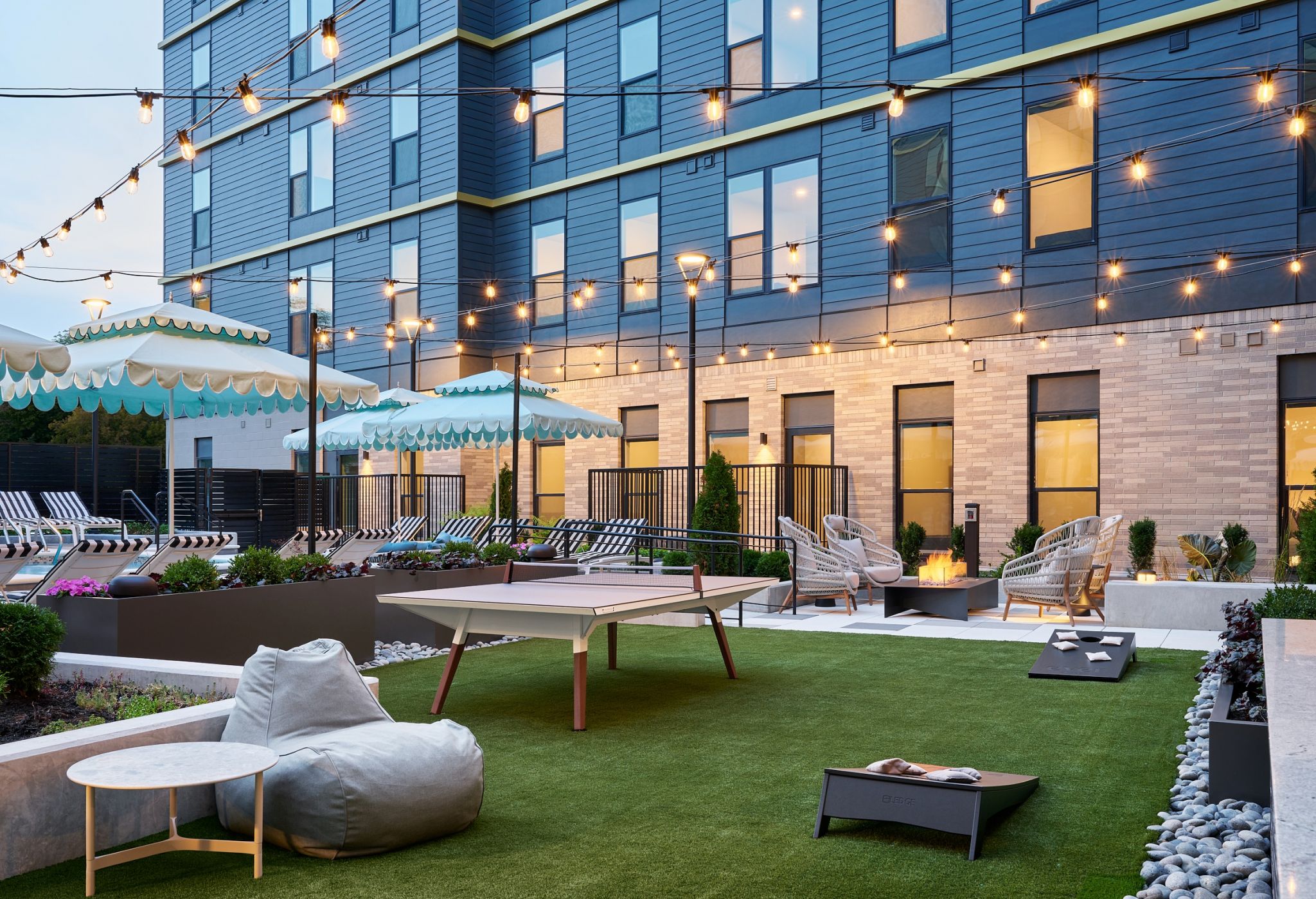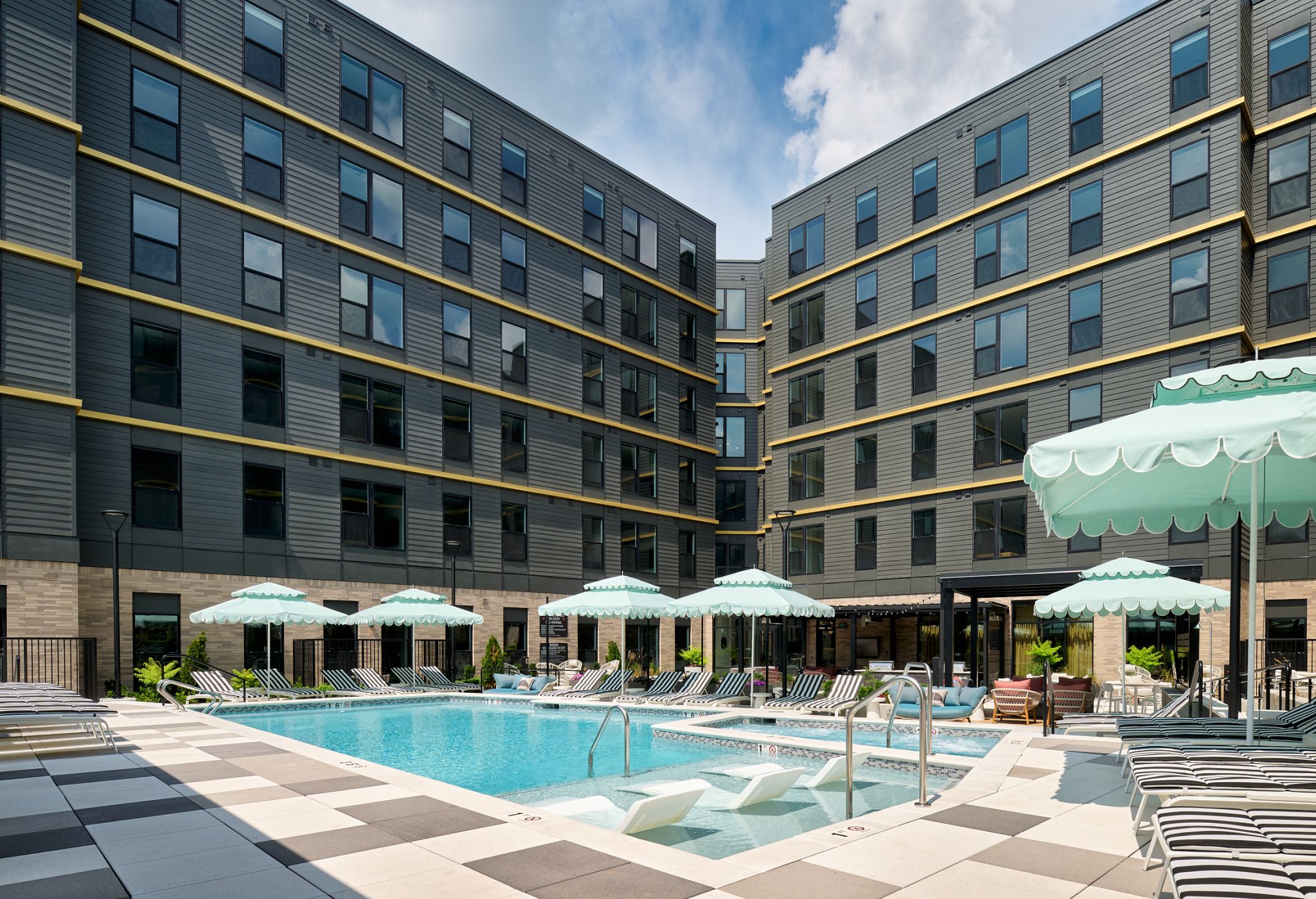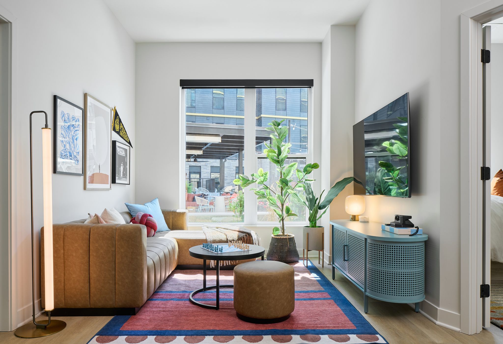 Interior living spaces are made for living well with features like premium wireless internet, 65” smart TVs, stainless steel appliances, and keyless entry, as well as finishes that wow, including quartz countertops, designer cabinets, matte black hardware, and roller shades for privacy and ambiance. All apartments are fully furnished with private bedrooms and bathrooms.